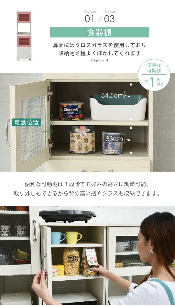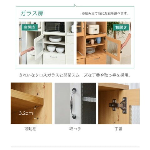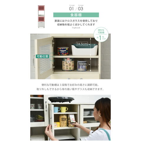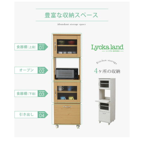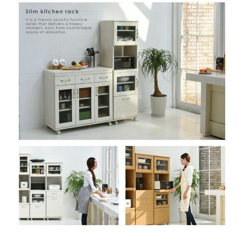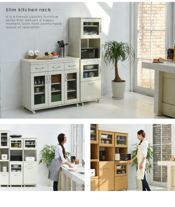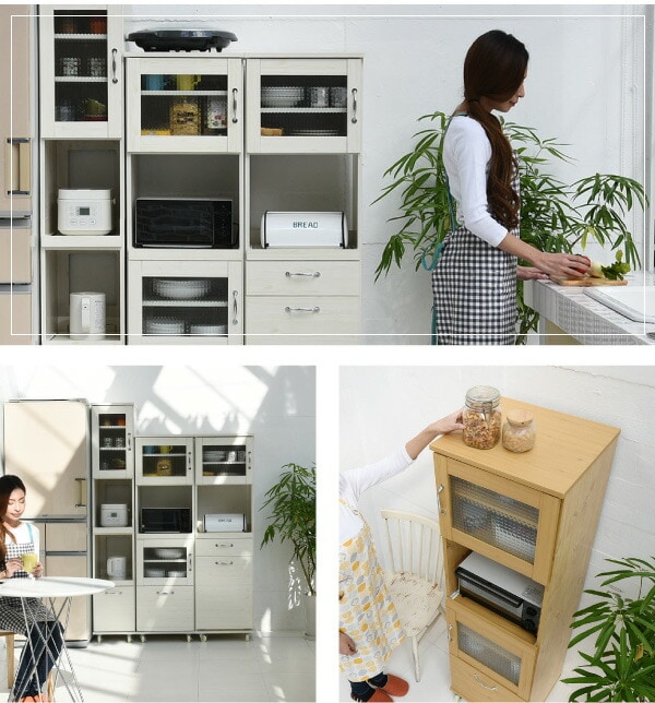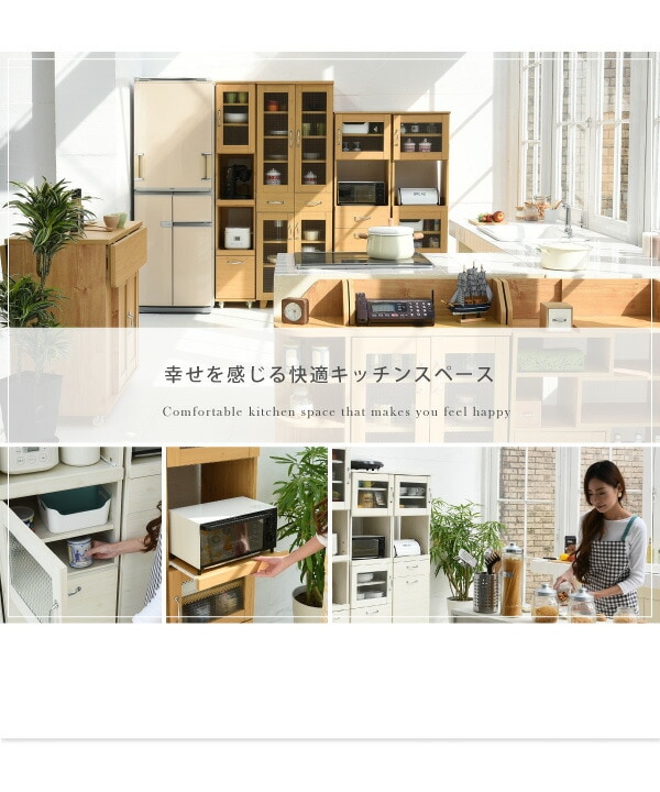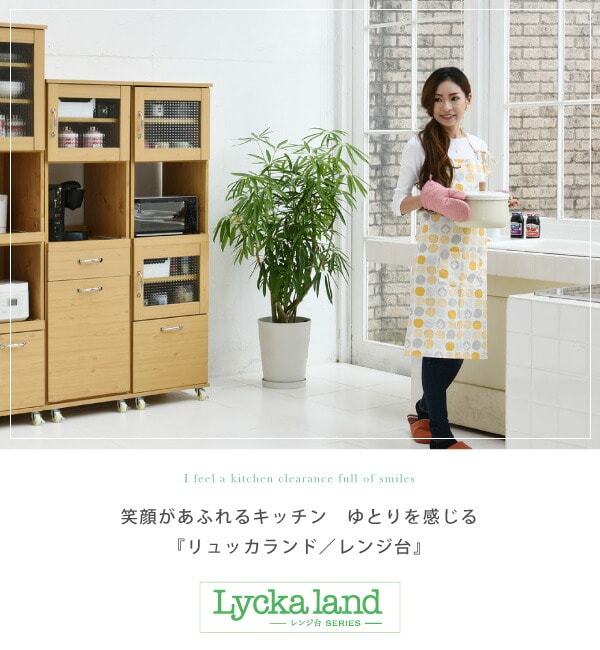 木目調とガラスのカントリーテイストが可愛いリュッカランドのキッチンシリーズ。スライド部や深型の引き出しなど豊富な収納スペースに、程よい高さで使い勝手◎