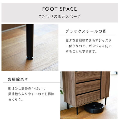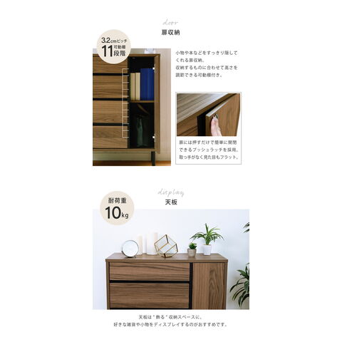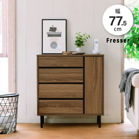 落ち着いた木目調のブラウンとブラックスチールの組み合わせがモダンな印象を与える、北欧テイストシリーズ“Fresser”。4段のチェストに扉収納がついたワイドチェストは、シンプルだからこそ使いやすいアイテムです。