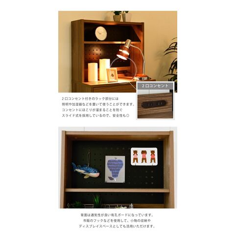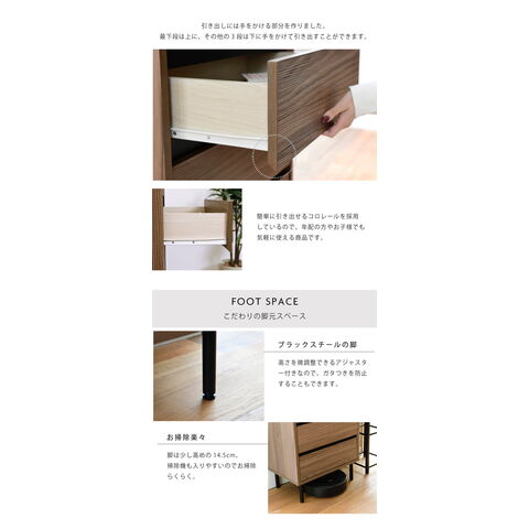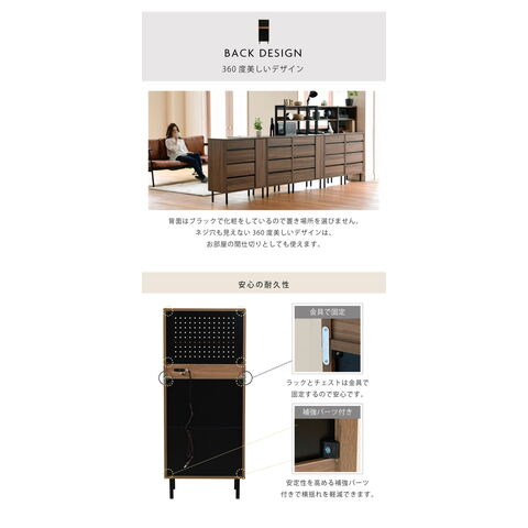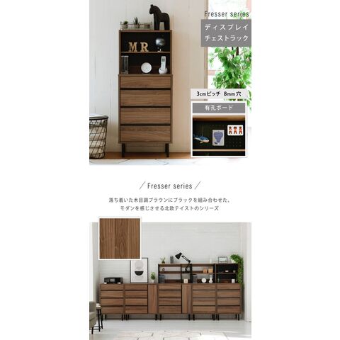 落ち着いた木目調のブラウンとブラックスチールの組み合わせがモダンな印象を与える、北欧テイストシリーズ“Fresser”。4段のチェストに有孔ボード付きのラックが付いたディスプレイチェストラック。シンプルなデザインながら、飾るもので個性を演出できます。