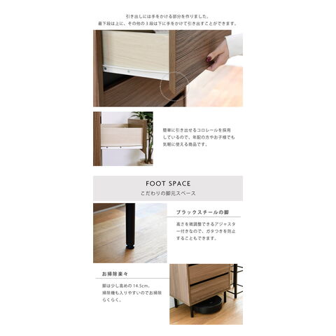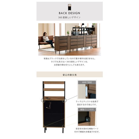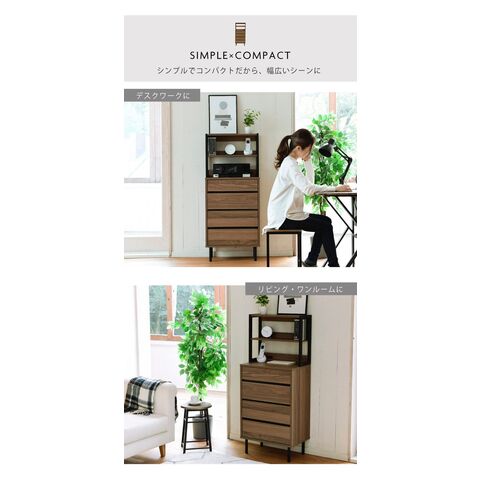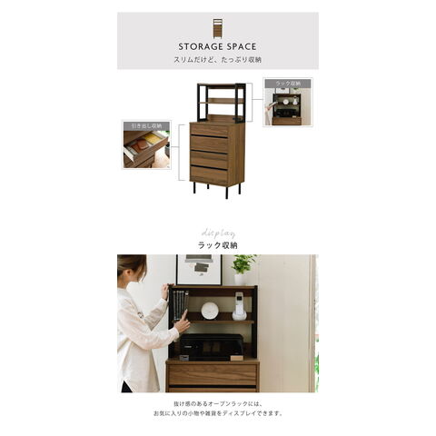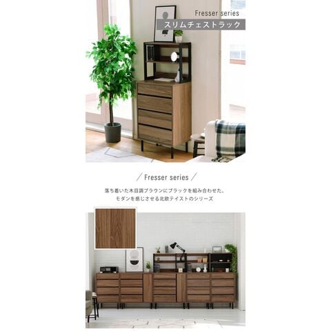 落ち着いた木目調のブラウンとブラックスチールの組み合わせがモダンな印象を与える、北欧テイストシリーズ“Fresser”。4段のチェストにオープンラックが付いたスリムチェストラック。シンプルなデザインながら、飾るもので個性を演出できます。