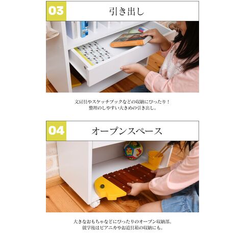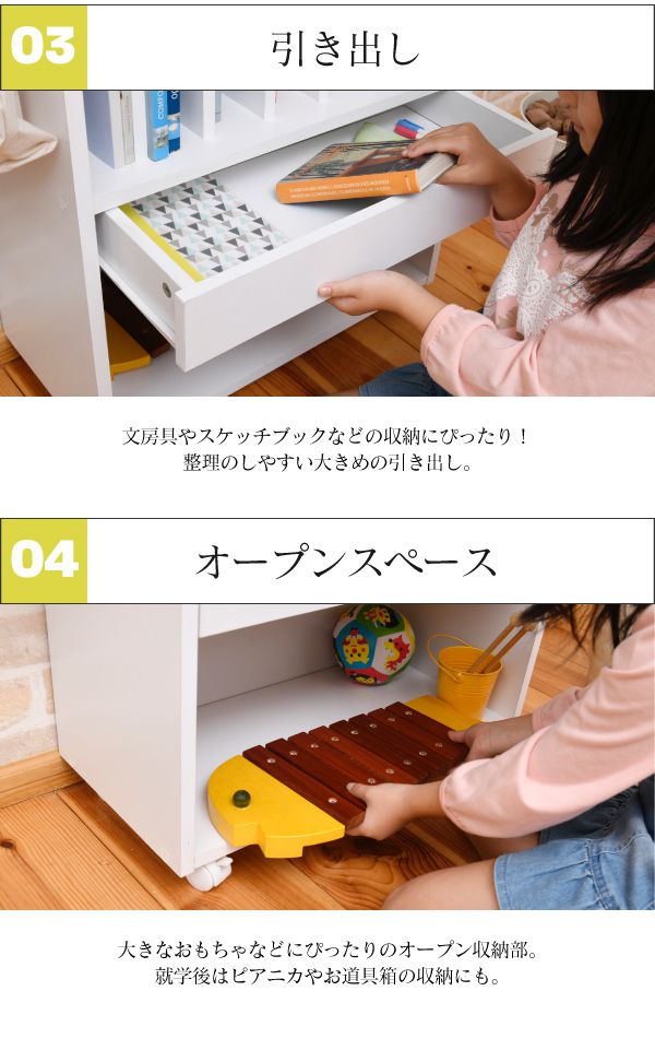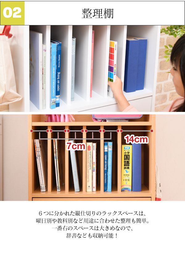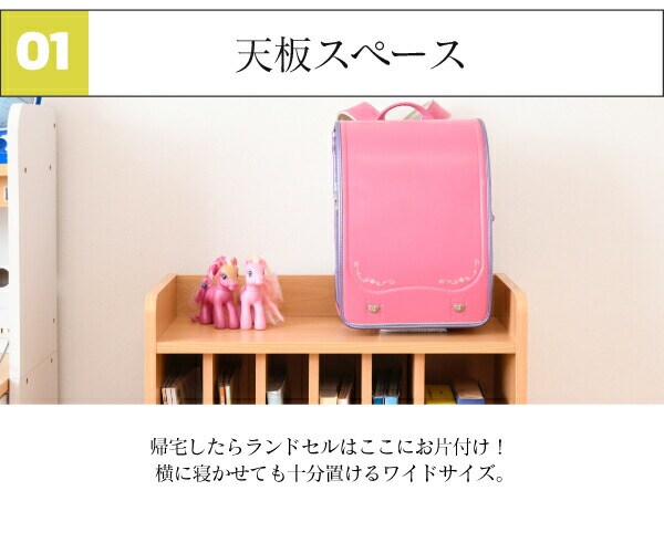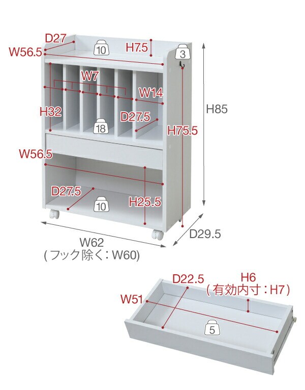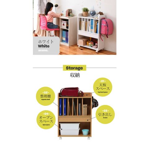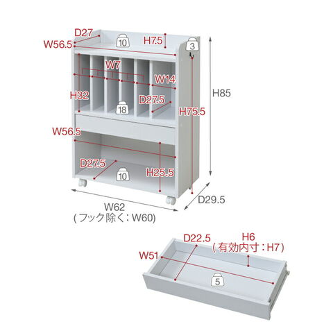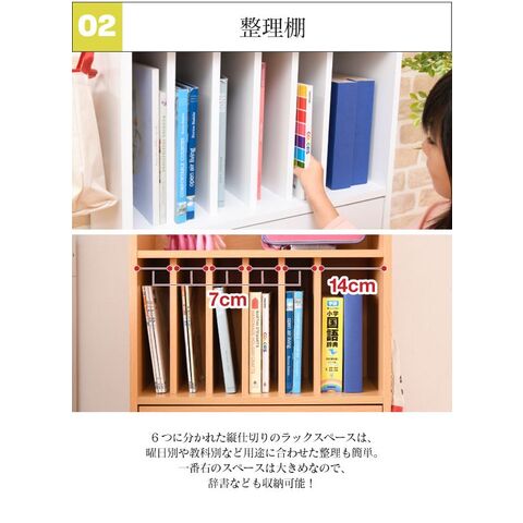 「リビング学習」にぴったりなキャスター付きのランドセルラック。真ん中の仕切り棚は6つに仕切られているので曜日や科目に合わせて収納できます。幅の広い右側は辞書などの収納に。真ん中の引出しはペンケース等や、学校から配られるプリント類に便利です。本体横は左右どちらかにフックの取り付けが可能です。