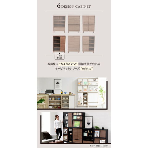 ガラス&扉キャビネット。6つのデザインと5つのカラーからお選びいただける6デザインキャビネット”Adatto”。ガラス扉部分にはディスプレイ、引出しには見せたくないものを収納。