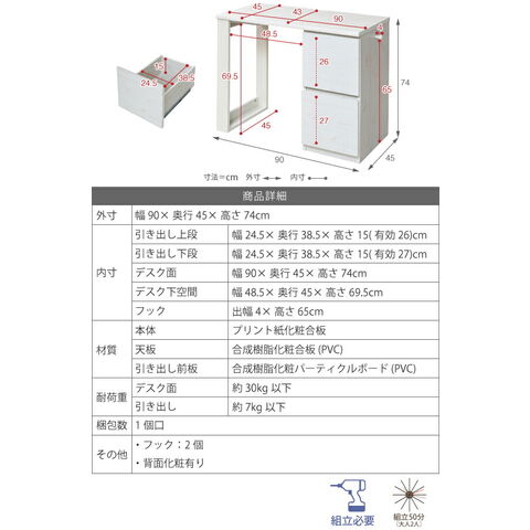 (デスク下空間)幅48.5×奥行45×高さ69.5cm