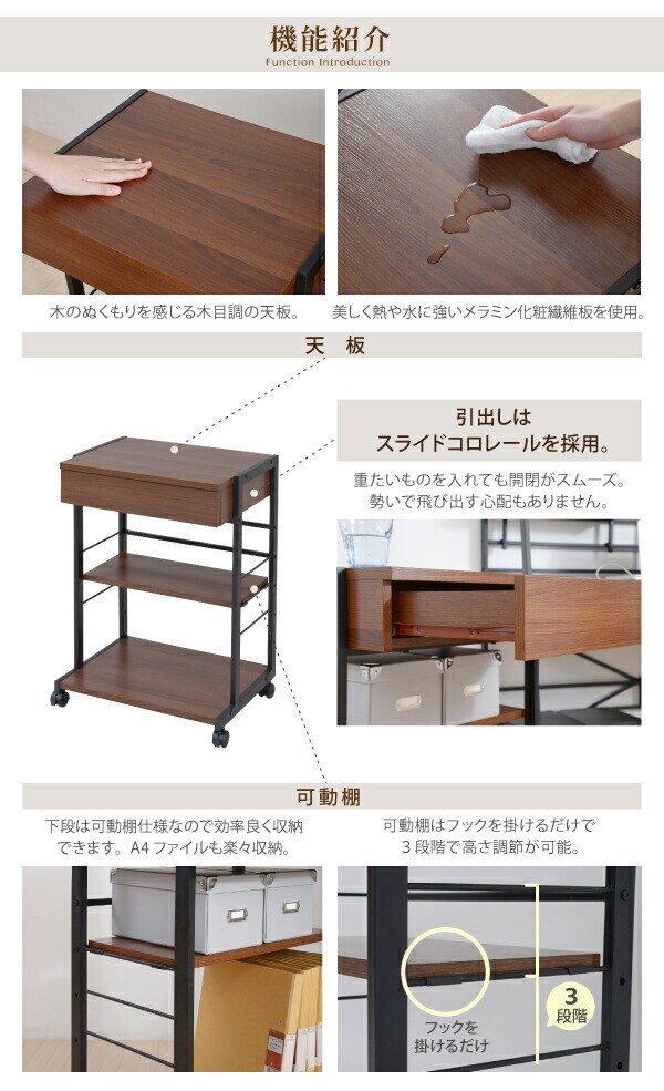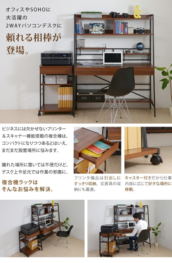2WAYパソコンデスクと共通デザイン、天板の高さもほぼ同一と、2WAYパソコンデスク横に最適な複合機ラック。キャスター付だからコロコロと好きな場所まで移動して、単独使用も。浅めの引き出しには、ノートや筆記用具、小物などが収納できます。下段は可動棚仕様なので、A4ファイルも収納可能。天板は熱や水に強いメラミン塗装だから、複合機置きとしてだけでなく、サイドテーブルとしての使用もOKです。