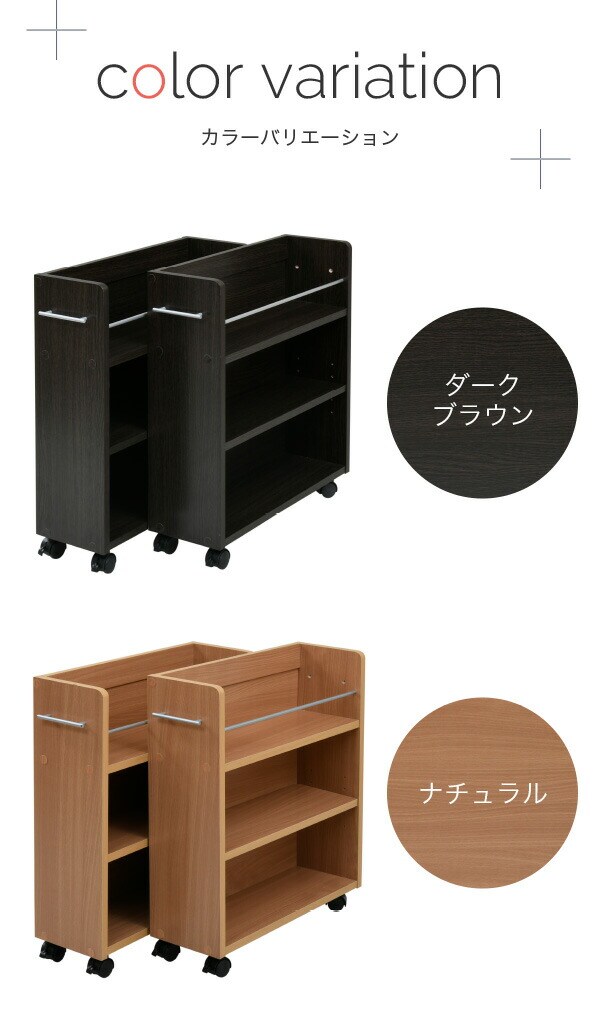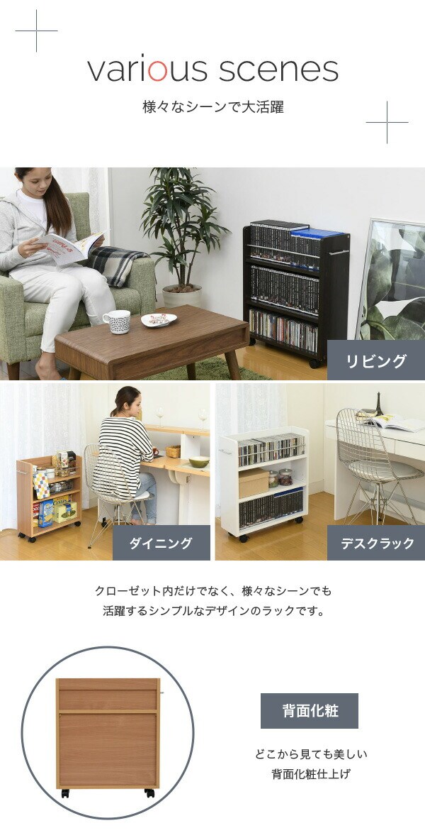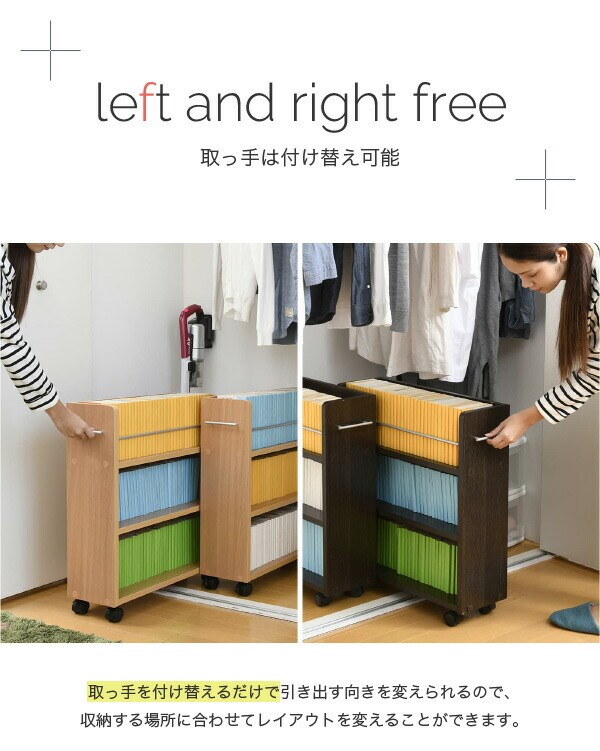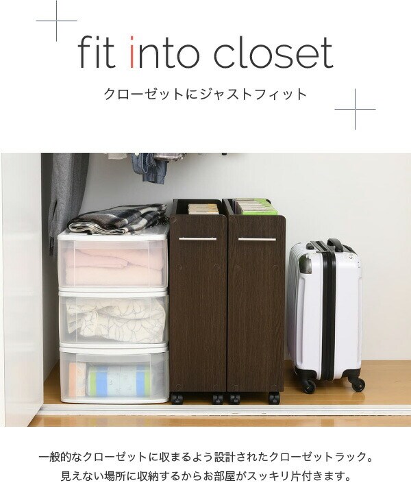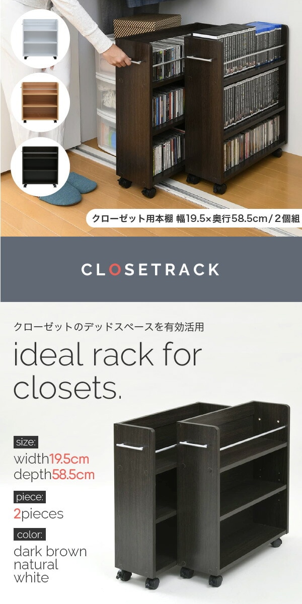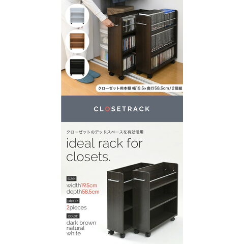 キャスター付きの便利なクローゼットラック2個組。取っ手はどちらにも取り付け可能なので、収納箇所の向きは左右入れ替えできます。本やメディア類や、日用品のストックまで、クローゼット内のスペースを有効活用するのでお部屋をすっきり片付けられます。