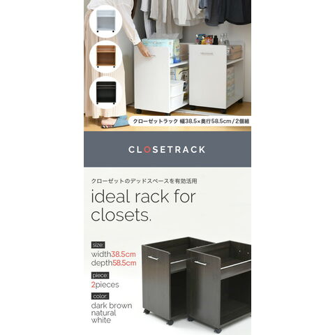 キャスター付きの便利なクローゼットラック2個組。取っ手はどちらにも取り付け可能なので、収納箇所の向きは左右入れ替えできます。幅が広いので収納場所に困る大きな日用品のストックにも最適。クローゼット内のスペースを有効活用するのでお部屋をすっきり片付けられます。