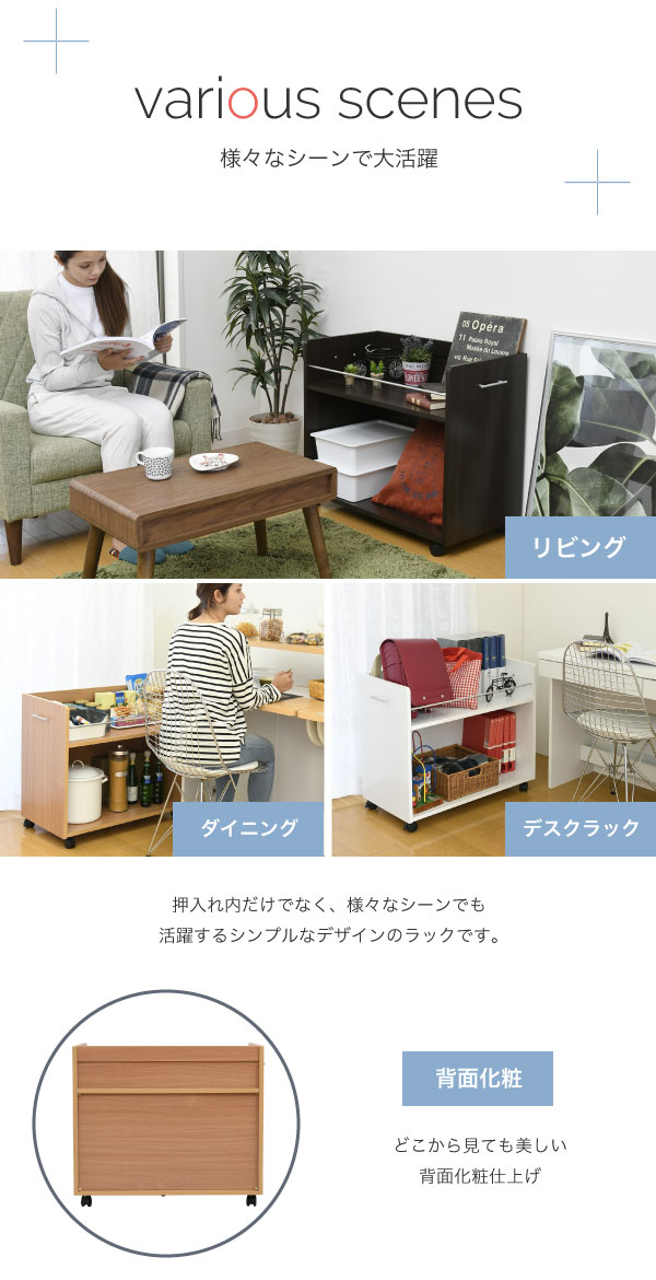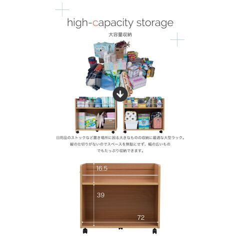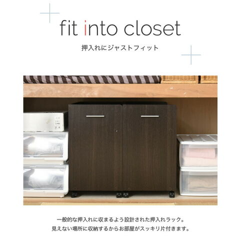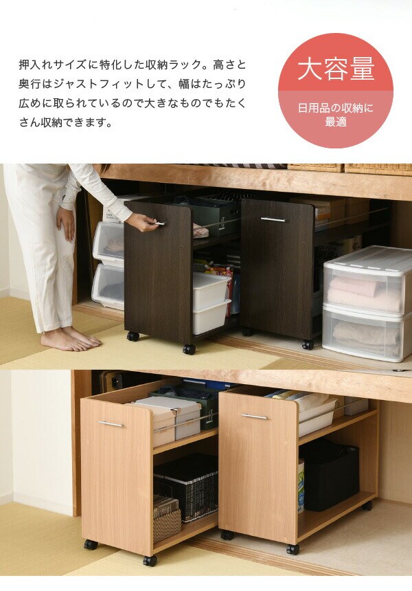 キャスター付きの便利な押入れラック2個組。取っ手はどちらにも取り付け可能なので、収納箇所の向きは左右入れ替えできます。幅が広いので収納場所に困る大きな日用品のストックにも最適。押入れ内のスペースを有効活用するのでお部屋をすっきり片付けられます。