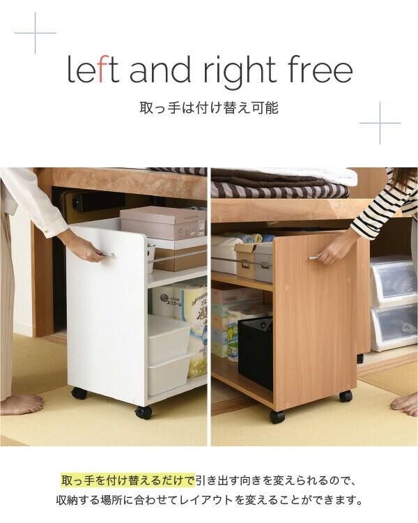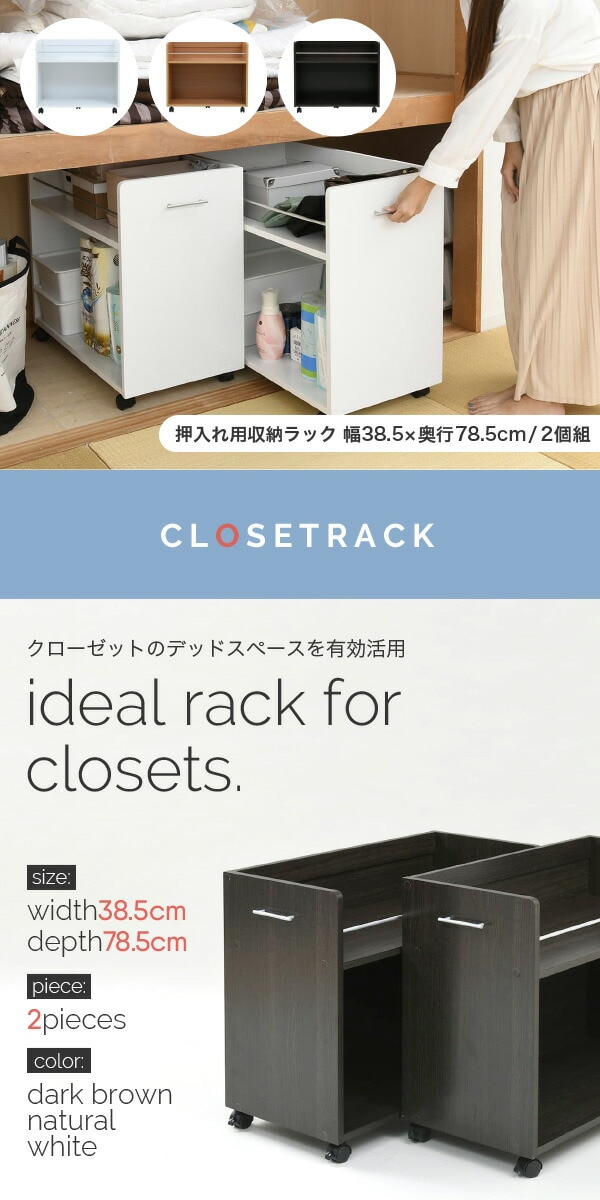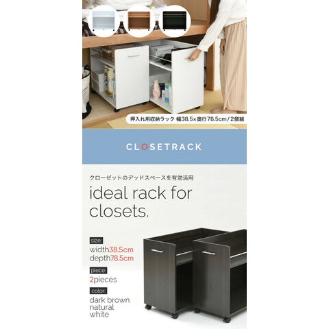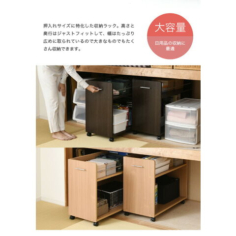 キャスター付きの便利な押入れラック2個組。取っ手はどちらにも取り付け可能なので、収納箇所の向きは左右入れ替えできます。幅が広いので収納場所に困る大きな日用品のストックにも最適。押入れ内のスペースを有効活用するのでお部屋をすっきり片付けられます。