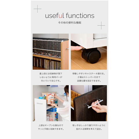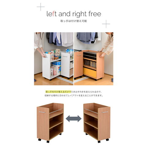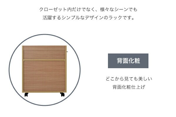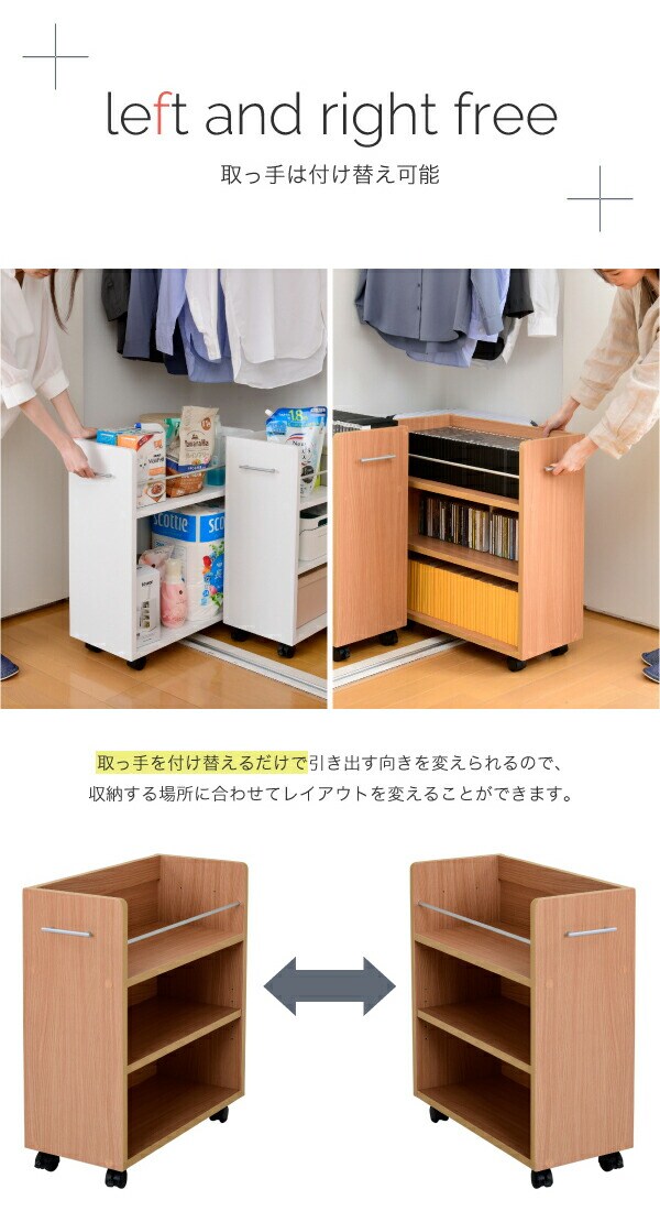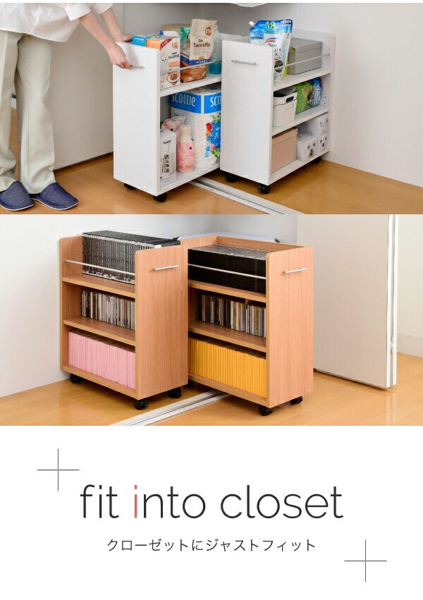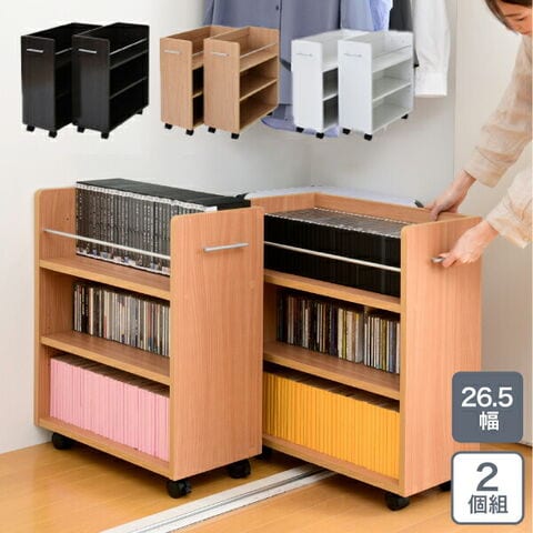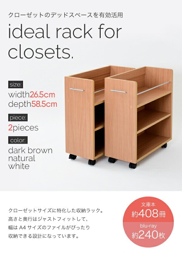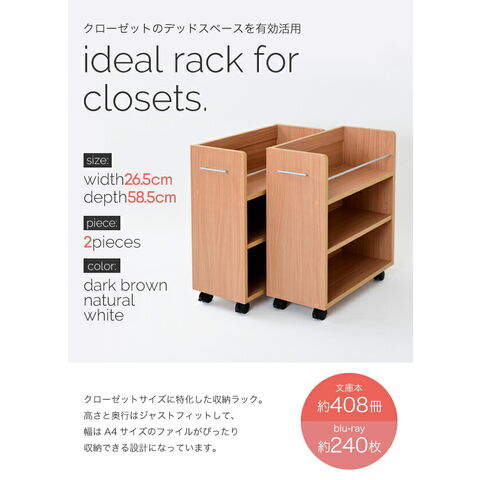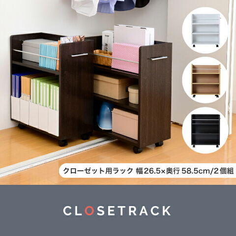 キャスター付きの便利なクローゼットラック2個組。取っ手はどちらにも取り付け可能なので、収納箇所の向きは左右入れ替えできます。A4ファイルがぴったり収納できるよう設計された幅26.5cm。本やメディア類や、日用品のストックなどの収納にぴったり。クローゼット内のスペースを有効活用できるのでお部屋をすっきり片付けられます。