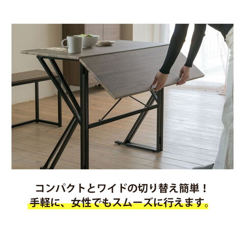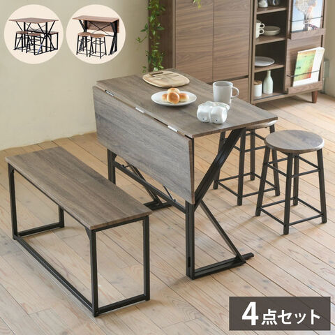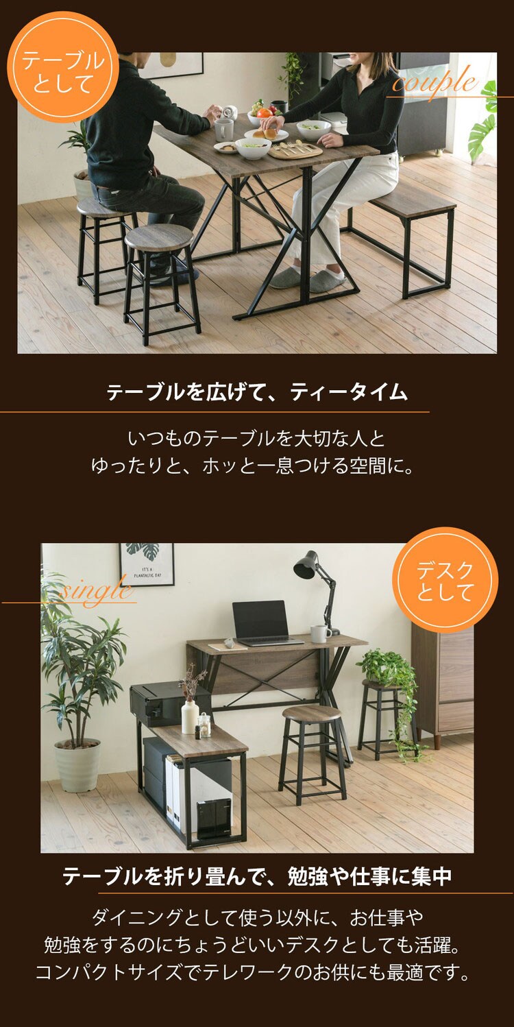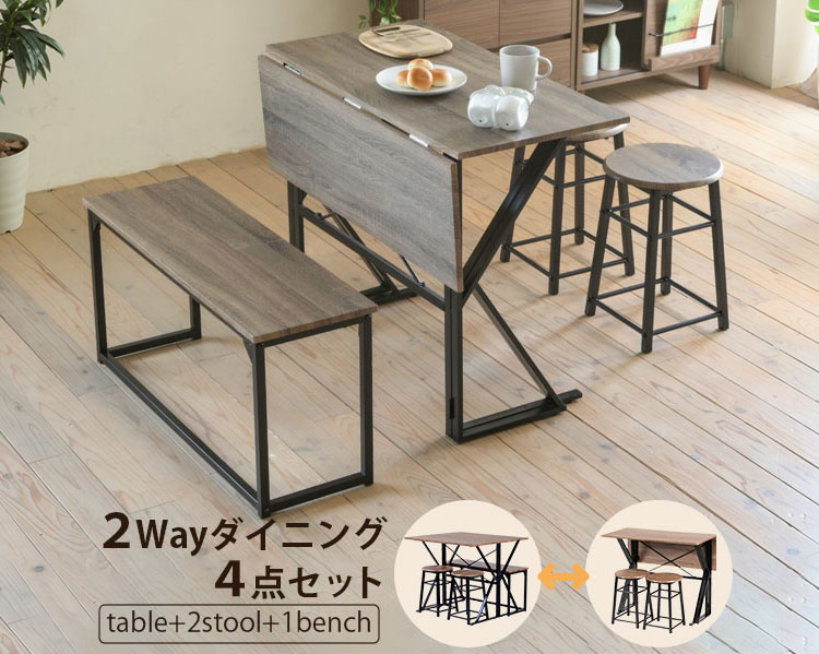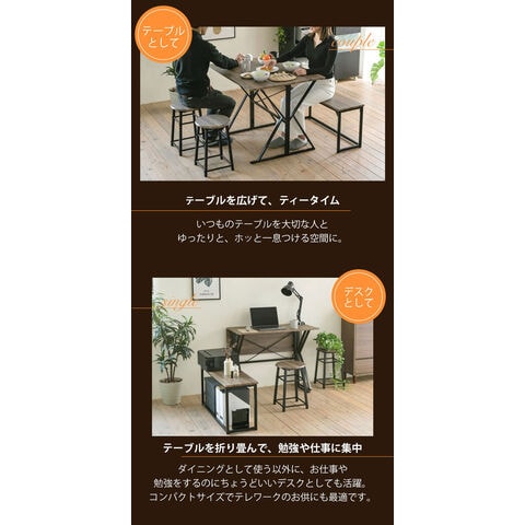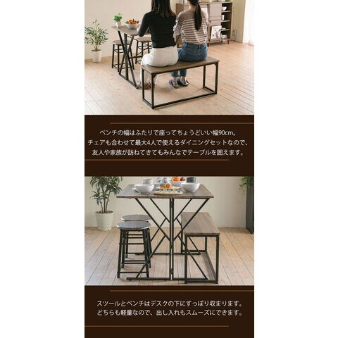 シーンに合わせて天板サイズを変えられるダイニングテーブルにイス2脚、2人掛けベンチが付いたダイニング4点セット。デスクとして使っても◎デスクとして使用するときはベンチがラックに、スツールがサイドテーブルに変身!