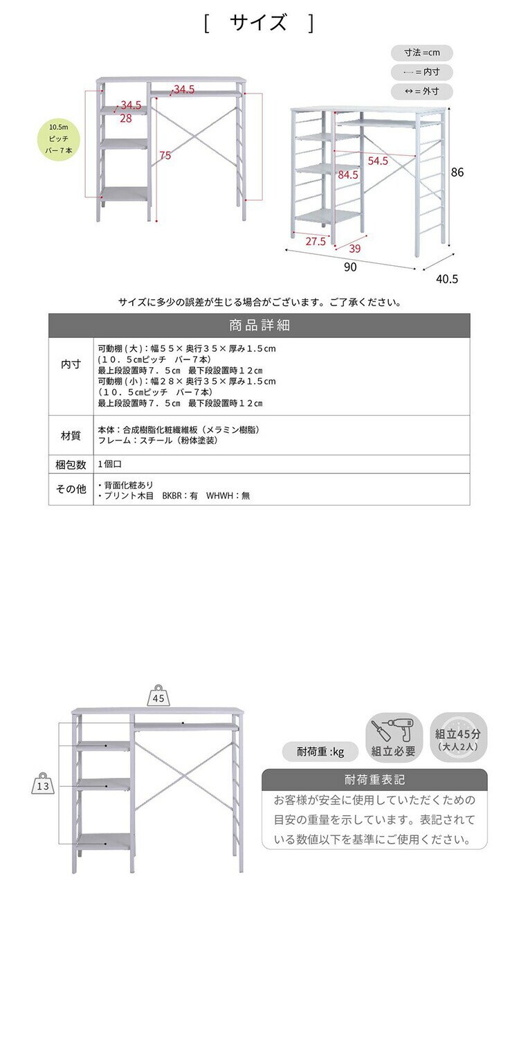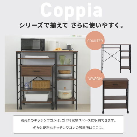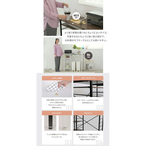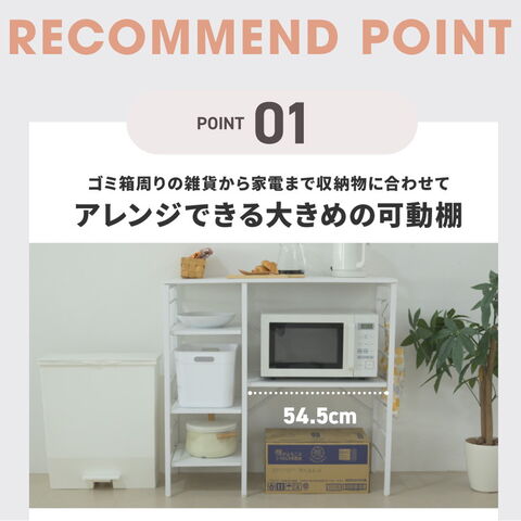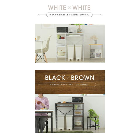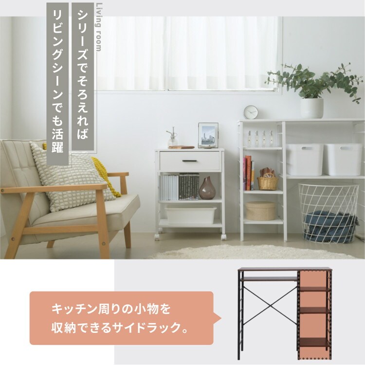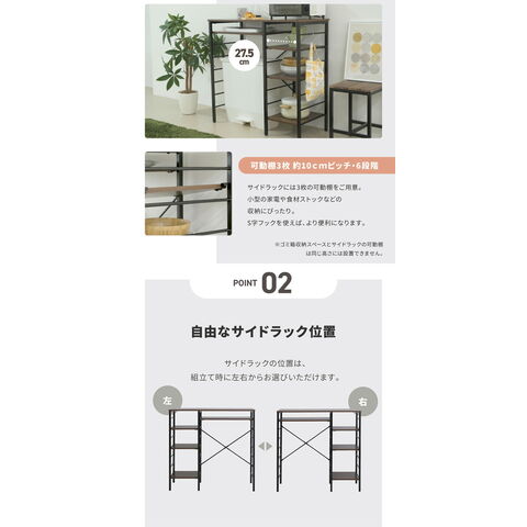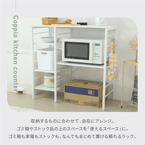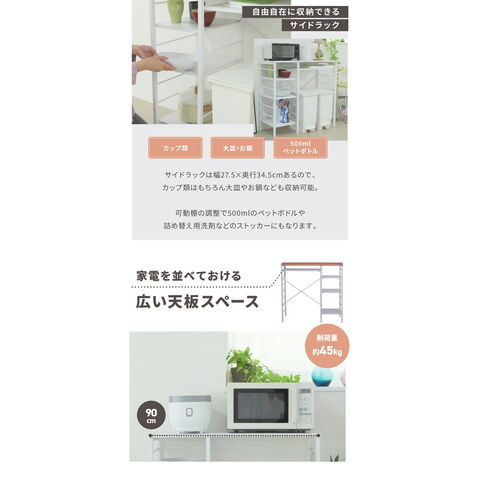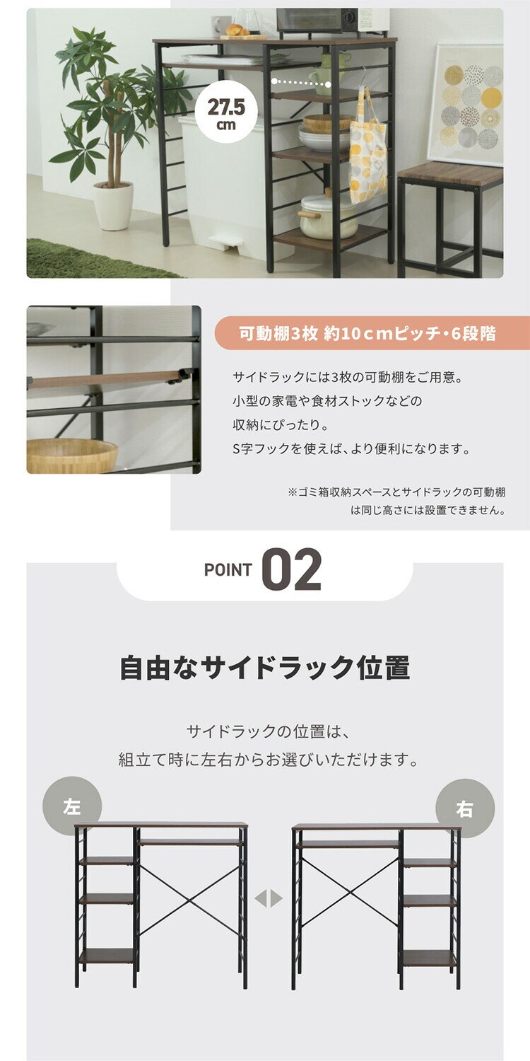 幅90cmの広々作業スペースとゴミ箱収納ができるキッチンカウンター。奥行き40cmなので、大きめの電子レンジなど置くこともできます。サイドの収納スペースは可動棚なので、収納するものに合わせて高さ調整が可能なラック。サイドフレームにはS字フックなどを使うことで、ちょこっと掛けにご活用いただけます。