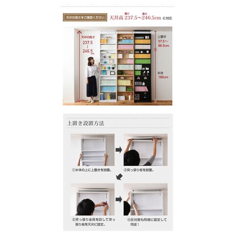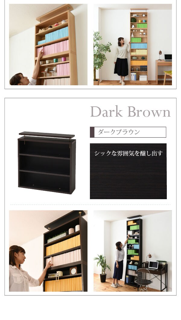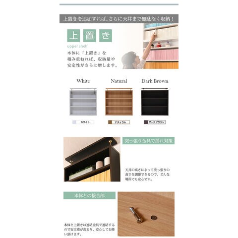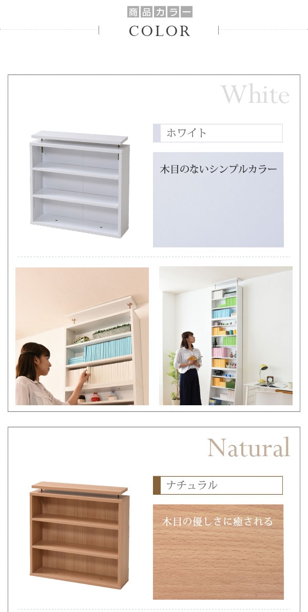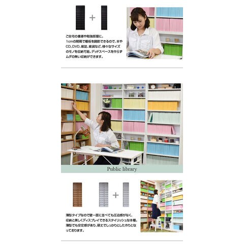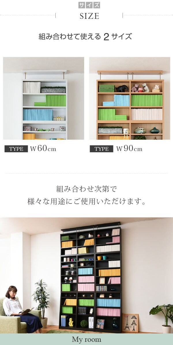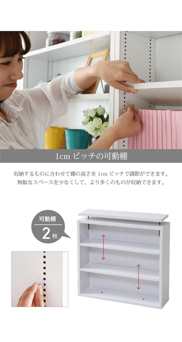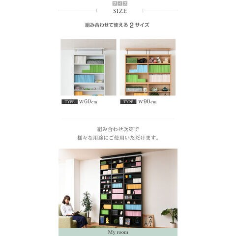 棚板を1cm間隔で調整できるので、本だけでなく、ディスプレイラックとして使える万能本棚。お部屋に合わせて選べる60幅、90幅をご用意。組み合わせて使えば、120幅、150幅としても使える大容量の文庫本ラック。本体と合わせれば、本棚の上のデットスペースも有効活用!