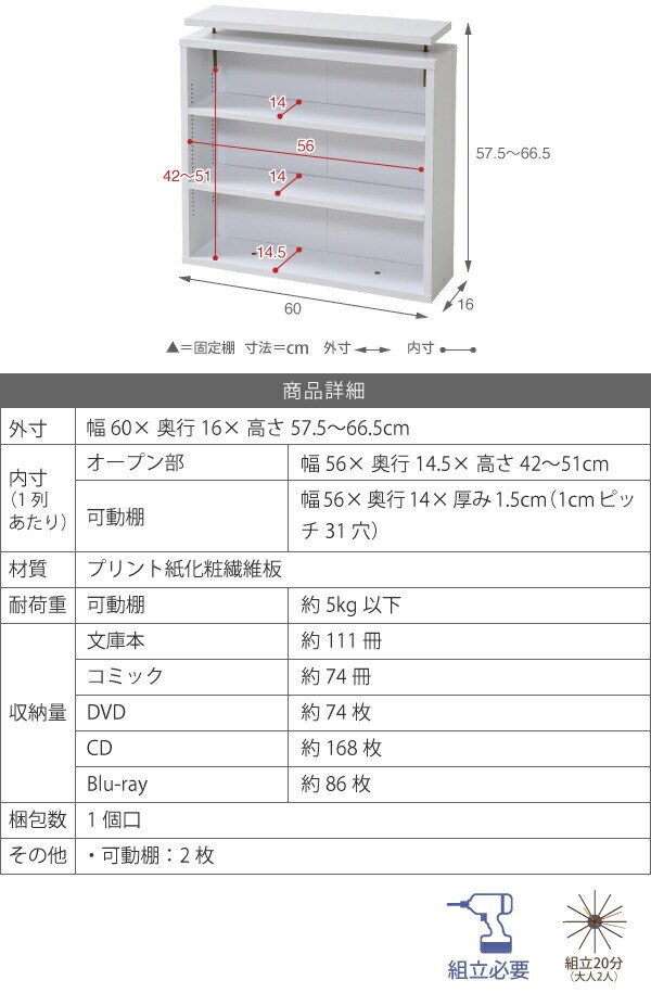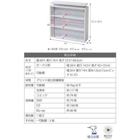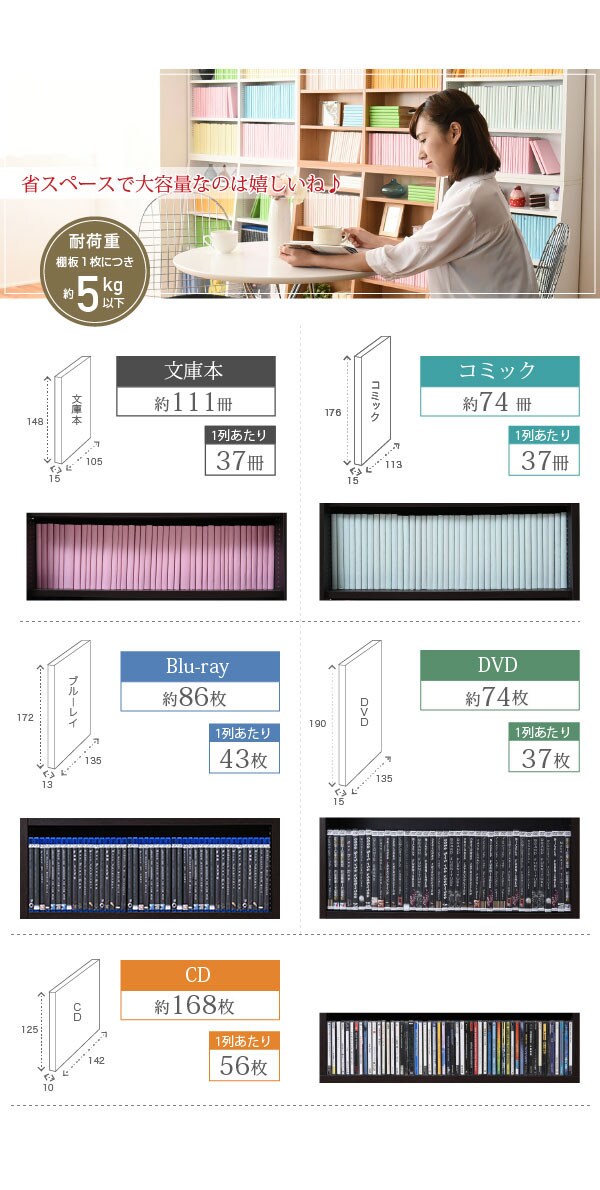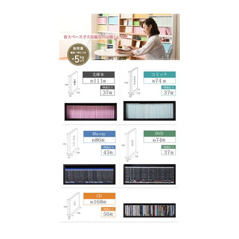 [収納量](文庫本)約111冊、(コミック)約74冊、(DVD)約74枚、(CD)約168枚、(Blu-ray)約86枚