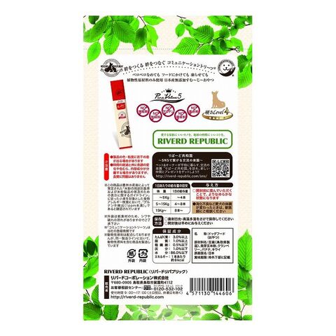 たんぱく質3.0%以上、脂質1.0%以上、粗繊維0.5%以下、灰分1.0%以下、水分86.0%以下、エネルギー約8kcal/本