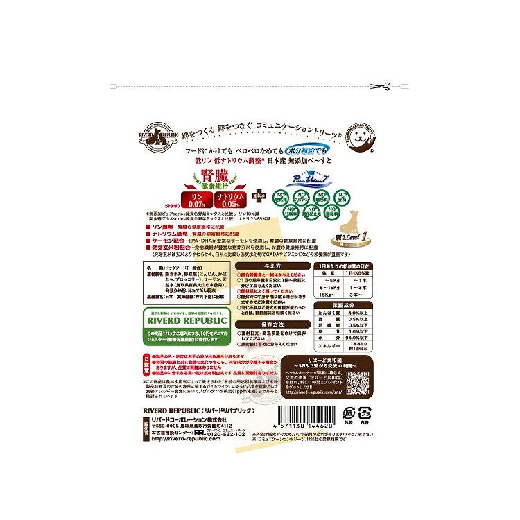 鶏ささみ、野菜類(にんじん、かぼちゃ、ブロッコリー)、サーモン、天然水(鳥取県奥大山の水使用)、発芽玄米粉、ほたてだし粉末