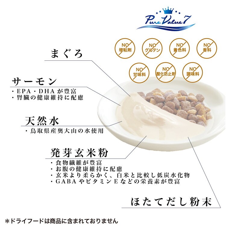 鶏ささみ、野菜類(にんじん、かぼちゃ、ブロッコリー)、サーモン、天然水(鳥取県奥大山の水使用)、発芽玄米粉、ほたてだし粉末