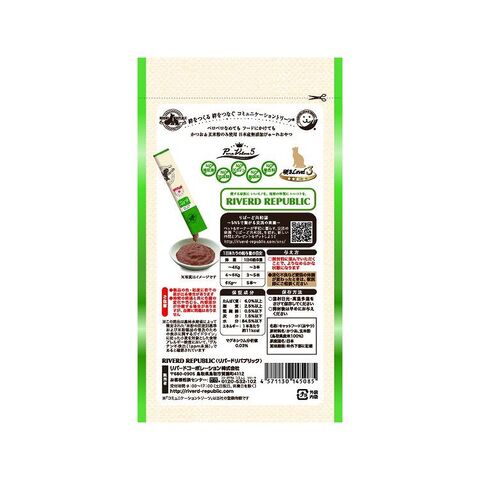 たんぱく質6.0%以上、脂質2.5%以上、粗繊維0.5%以下、灰分1.5%以下、水分84.5%以下、エネルギー約11kcal/本