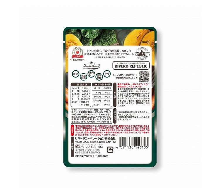 鶏むね、野菜類(かぼちゃ、にんじん、ブロッコリー)、チーズ、グリーンバナナスターチ、焼き牡蠣粉末、焼き椎茸粉末、寒天、キトサンオリゴ糖、乳酸菌生産物質粉末、秋ウコン粉末