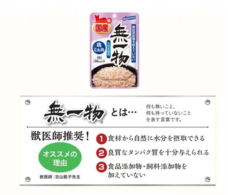食品添加物を一切加えず、鶏むね肉と天然水だけで仕上げた、水煮タイプの国産・無添加のキャットフードです。