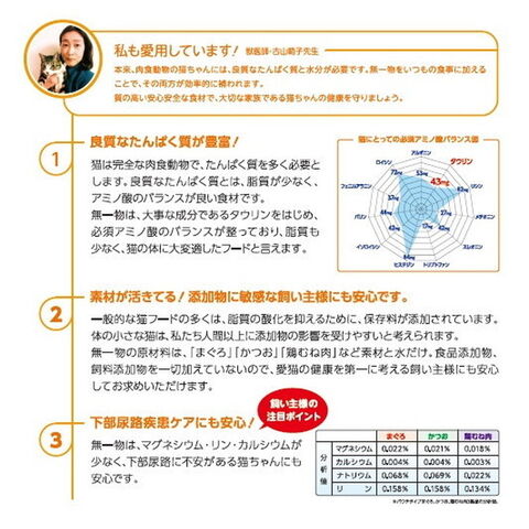 たんぱく質…15%以上、脂質…1%以上、粗繊維…0.5%以下、灰分…1%以上、水分…82%以下