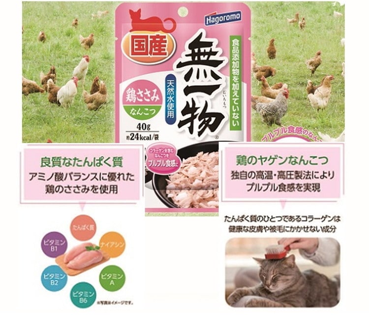 食品添加物を一切加えず、鶏ささみに鶏なんこつと天然水だけで仕上げた、水煮タイプの国産・無添加んぽキャットフードです。鶏なんこつはコラーゲンたっぷりなプルプル食感です。