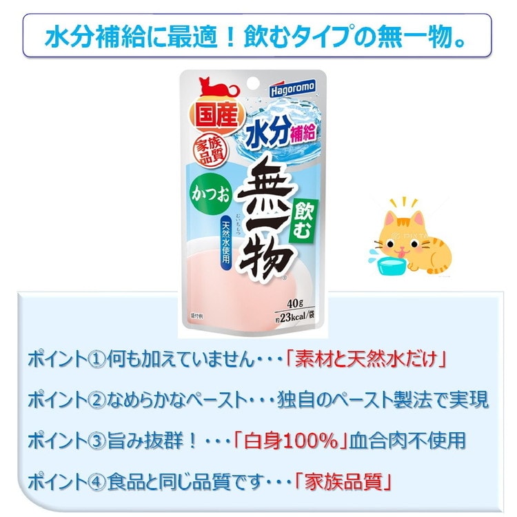 水分補給に最適。飲むタイプの無一物。素材と天然水だけで仕上げた国産・無添加のキャットフード