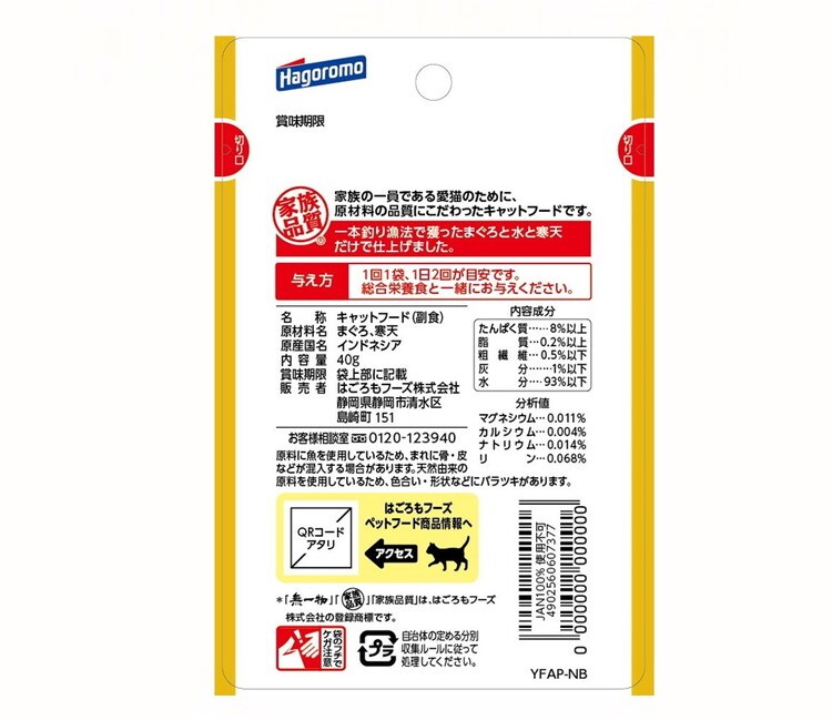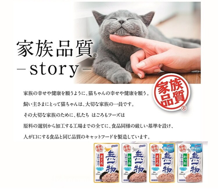 一本釣り漁法で獲ったまぐろと水と寒天を使っでゼリータイプに仕上げた無添加キャットフードです。つるっと取り出しやすいタイプです。食品と同じ原料を使用して仕上げた家族品質です。