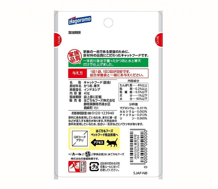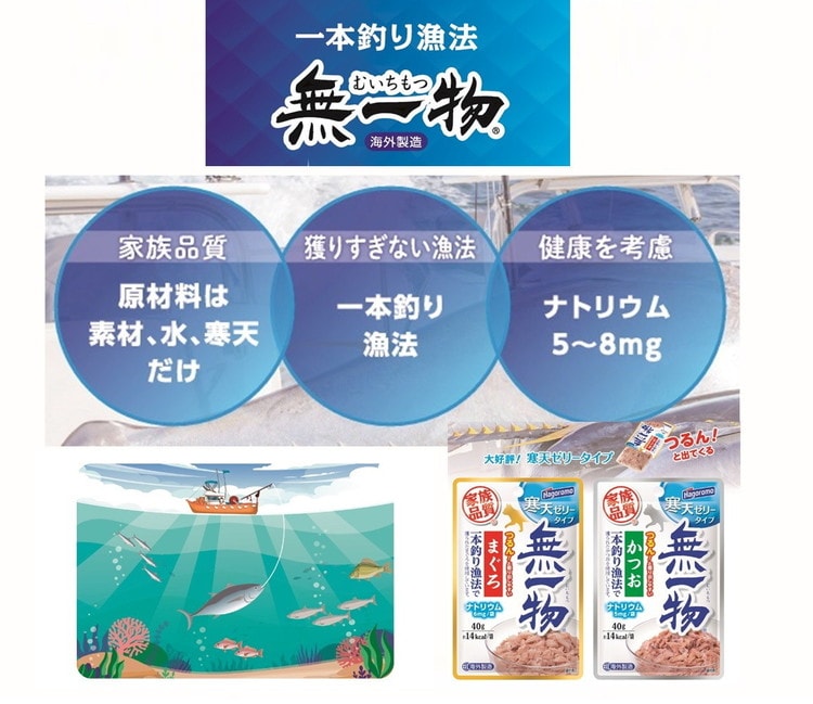 一本釣り漁法で獲ったかつおと水と寒天を使っでゼリータイプに仕上げた無添加キャットフードです。つるっと取り出しやすいタイプです。食品と同じ原料を使用して仕上げた家族品質です。