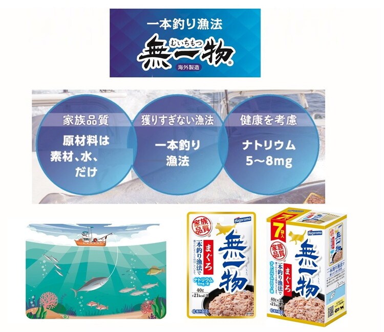 「一本釣り漁法」で獲ったまぐろと水だけで仕上げた、原材料の品質にこだわったキャットフードです。便利な7個パック