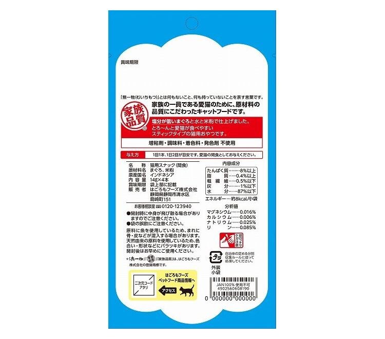 塩分が低いまぐろと水と米粉で仕上げました。とろ~んと食べやすいスティックタイプの猫用おやつです。