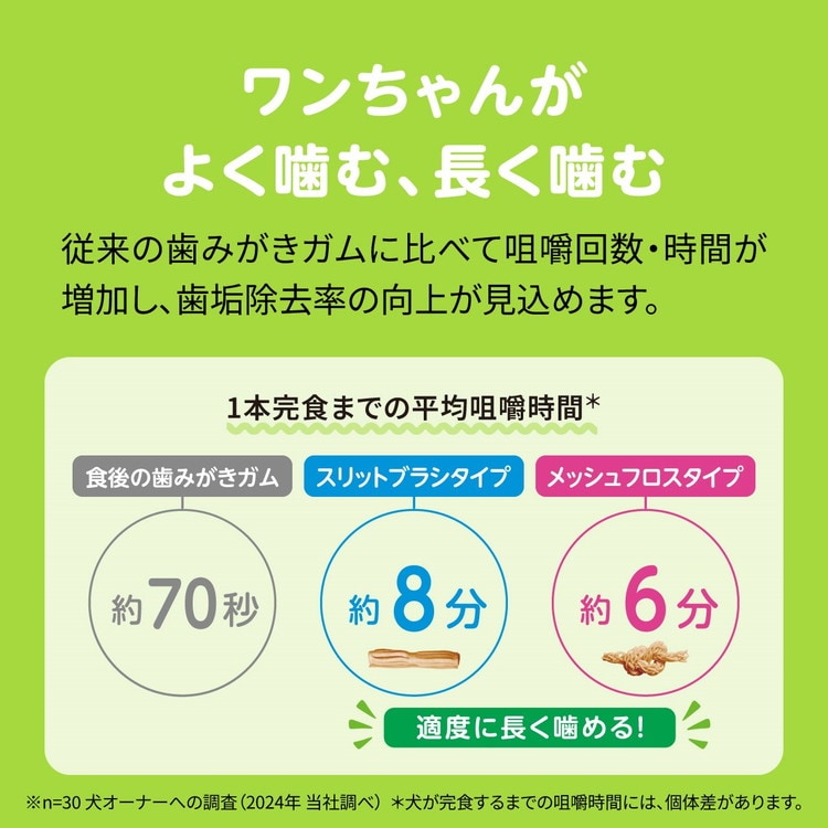 スリット構造が歯面に密着し、噛むことで歯垢を除去。噛む力がかかり過ぎない適度な弾力でしっかり噛める。