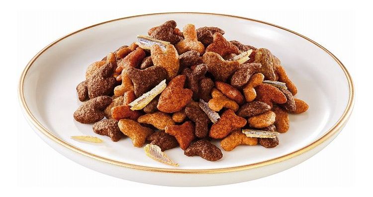穀類(とうもろこし、とうもろこしたんぱく、小麦、米等)、肉類(チキンミール等)、動物性油脂、魚介類(まぐろ、かつお、小魚)、たんぱく加水分解物、フレーバーブレンド(鯛、サーモン、かに、サーディン、えび等)、ミネラル類(カルシウム、リン、カリウム、ナトリウム、クロライド、鉄、銅、マンガン、亜鉛、ヨウ素、セレン)、ビタミン類(A、E、K、B1、B2、パントテン酸、ナイアシン、B6、葉酸、ビオチン、B12、コリン)、アミノ酸類(メチオニン、タウリン)、着色料(カラメル色素、カロテノイド色素)