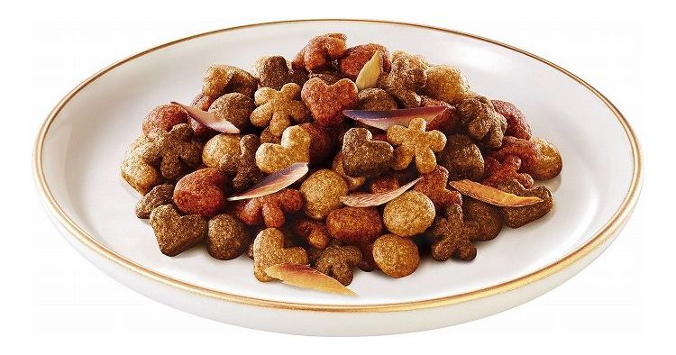 穀類(とうもろこし、とうもろこしたんぱく、米、小麦、オーツ麦等)、肉類(チキンミール等)、大豆粉、動物性油脂、食物繊維、たんぱく加水分解物、魚介類(まぐろ、かつお、かつお節)、フレーバーブレンド(鯛、サーモン、海藻等)、ミネラル類(カルシウム、リン、カリウム、ナトリウム、クロライド、鉄、銅、マンガン、亜鉛、ヨウ素、セレン)、ビタミン類(A、E、K、B1、B2、パントテン酸、ナイアシン、B6、葉酸、ビオチン、B12、コリン)、アミノ酸類(メチオニン、タウリン)、着色料(カラメル色素、カロテノイド色素)