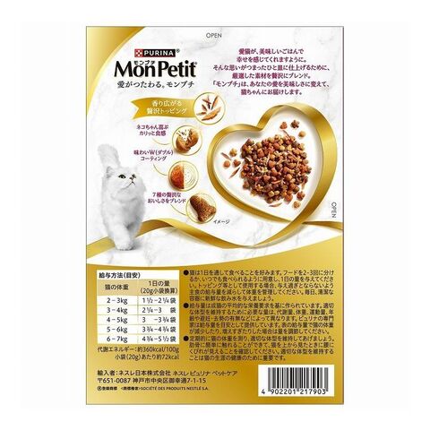 穀類(とうもろこし、とうもろこしたんぱく、米、小麦、オーツ麦等)、肉類(チキンミール等)、大豆粉、動物性油脂、食物繊維、たんぱく加水分解物、魚介類(まぐろ、かつお、かつお節)、フレーバーブレンド(鯛、サーモン、海藻等)、ミネラル類(カルシウム、リン、カリウム、ナトリウム、クロライド、鉄、銅、マンガン、亜鉛、ヨウ素、セレン)、ビタミン類(A、E、K、B1、B2、パントテン酸、ナイアシン、B6、葉酸、ビオチン、B12、コリン)、アミノ酸類(メチオニン、タウリン)、着色料(カラメル色素、カロテノイド色素)
