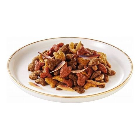 穀類(とうもろこし、とうもろこしたんぱく、小麦、米等)、肉類(チキンミール等)、動物性油脂、魚介類(まぐろ、かつお、かつお節)、たんぱく加水分解物、フレーバーブレンド(鯛、かに、えび、サーモン等)、ミネラル類(カルシウム、リン、カリウム、ナトリウム、クロライド、鉄、銅、マンガン、亜鉛、ヨウ素、セレン)、ビタミン類(A、E、K、B1、B2、パントテン酸、ナイアシン、B6、葉酸、ビオチン、B12、コリン)、アミノ酸類(メチオニン、タウリン)、着色料(カラメル色素、カロテノイド色素)