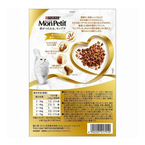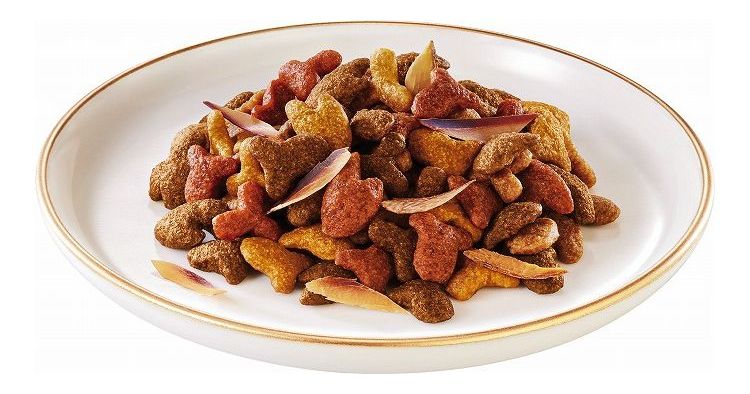 穀類(とうもろこし、とうもろこしたんぱく、小麦、米等)、肉類(チキンミール等)、動物性油脂、魚介類(まぐろ、かつお、かつお節)、たんぱく加水分解物、フレーバーブレンド(鯛、かに、えび、サーモン等)、ミネラル類(カルシウム、リン、カリウム、ナトリウム、クロライド、鉄、銅、マンガン、亜鉛、ヨウ素、セレン)、ビタミン類(A、E、K、B1、B2、パントテン酸、ナイアシン、B6、葉酸、ビオチン、B12、コリン)、アミノ酸類(メチオニン、タウリン)、着色料(カラメル色素、カロテノイド色素)