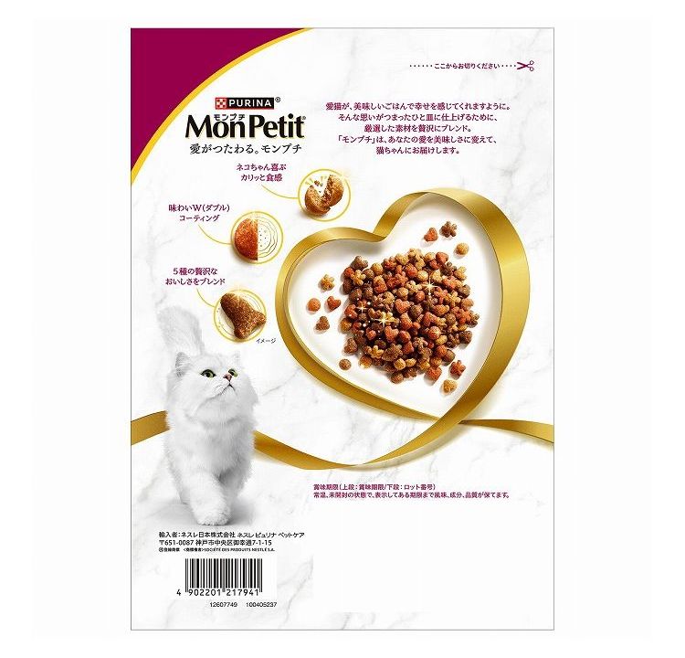 穀類(とうもろこし、とうもろこしたんぱく、米、小麦、オーツ麦等)、肉類(チキンミール等)、大豆粉、動物性油脂、食物繊維、たんぱく加水分解物、魚介類(まぐろ、かつお)、フレーバーブレンド(鯛、海藻等)、ミネラル類(カルシウム、リン、カリウム、ナトリウム、クロライド、鉄、銅、マンガン、亜鉛、ヨウ素、セレン)、ビタミン類(A、E、K、B1、B2、パントテン酸、ナイアシン、B6、葉酸、ビオチン、B12、コリン)、アミノ酸類(メチオニン、タウリン)、着色料(カラメル色素、カロテノイド色素)