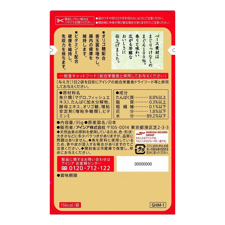 魚介類(マグロ、フィッシュエキス)、たんぱく加水分解物、酵母エキス、オリゴ糖、増粘安定剤(増粘多糖類)、ビタミンE