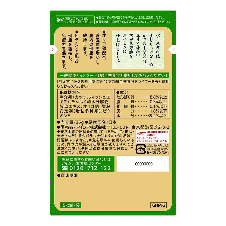 魚介類(カツオ、フィッシュエキス)、たんぱく加水分解物、酵母エキス、オリゴ糖、増粘安定剤(増粘多糖類)、ビタミンE