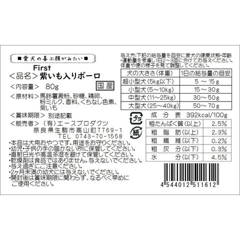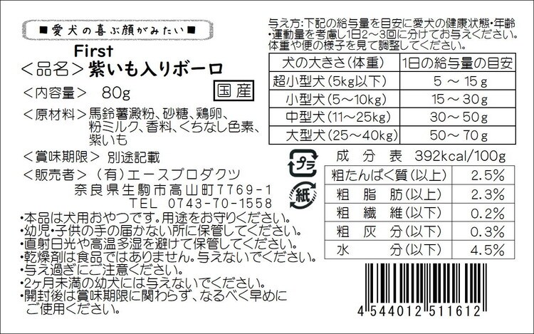 馬鈴薯澱粉、砂糖、卵、粉ミルク、香料、クチナシ色素、紫いも