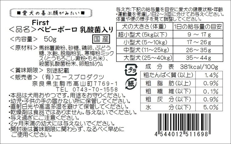 馬鈴薯澱粉、砂糖、鶏卵、ブドウ糖、水あめ、脱脂粉乳、寒梅粉ミックス(とうもろこし・でん粉・もち米)、殺菌乳酸菌粉末、卵殻カルシウム