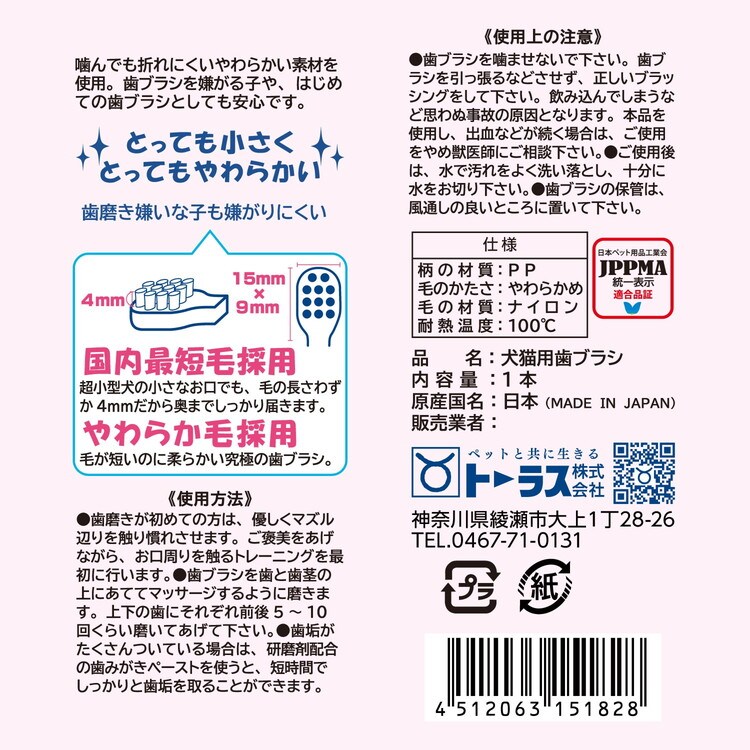 噛んでも折れにくい柔らかい素材の歯ブラシ。やわらかい毛で愛犬の負担が小さい。