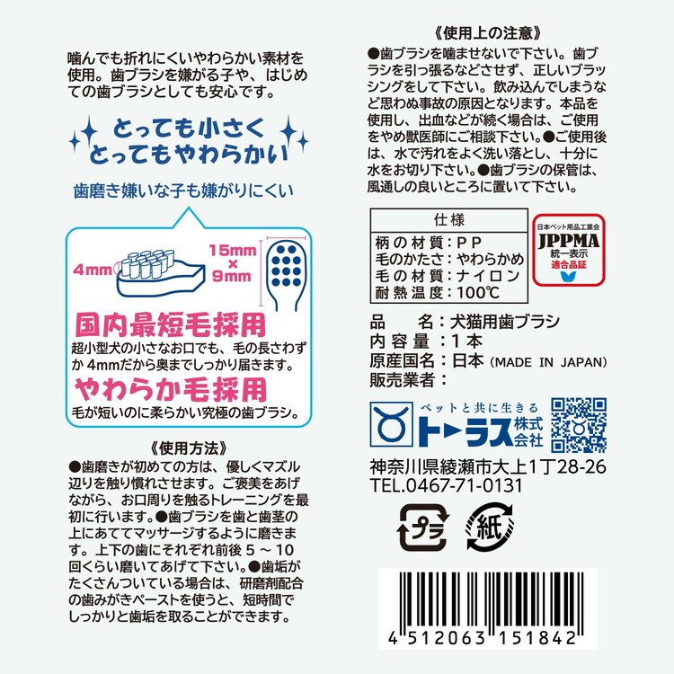 噛んでも折れにくい柔らかい素材の歯ブラシ。やわらかい毛で愛犬の負担が小さい。