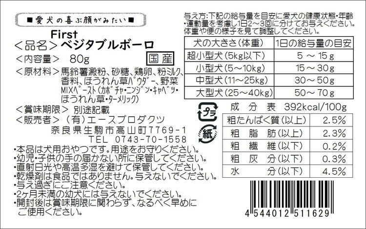 馬鈴薯澱粉、砂糖、卵、粉ミルク、香料、ほうれん草パウダー、野菜MIXペースト(カボチャ、人参、キャベツ、ほうれん草、ターメリック)
