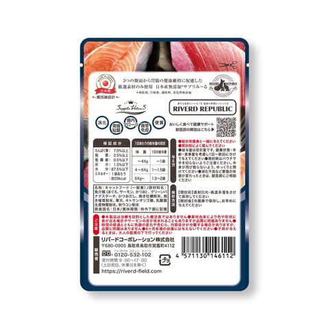 魚介類(まぐろ、サーモン、かつお)、グリーンバナナスターチ、かつおだし、焼き牡蠣粉末、焼き椎茸粉末、寒天、キトサンオリゴ糖、乳酸菌生産物質粉末、秋ウコン粉末