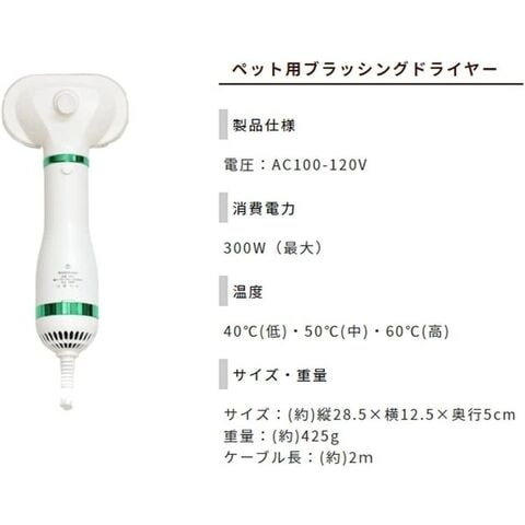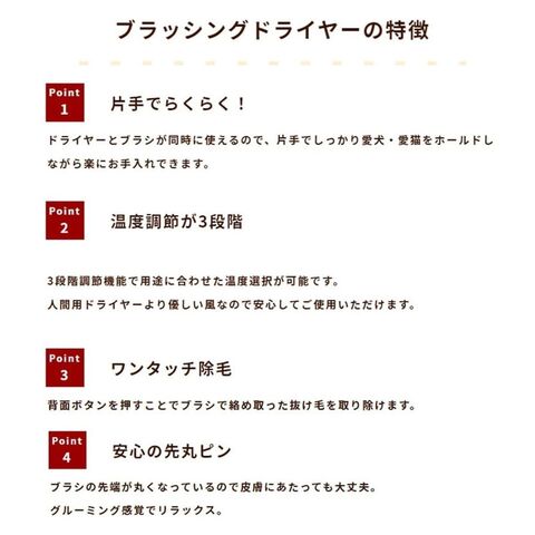 ドライヤーとブラシが同時に使えるので、片手でしっかり愛犬・愛猫をホールドできるので楽にお手入れが出来ます。