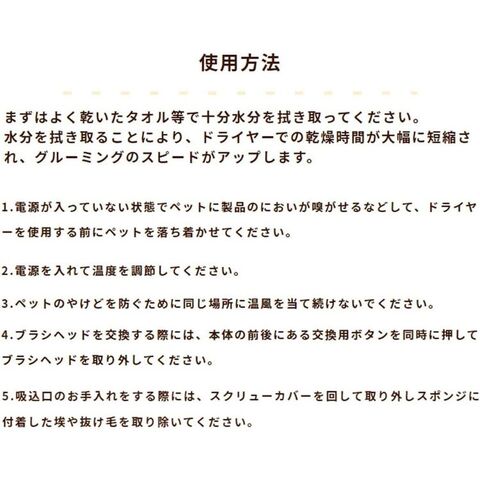 ※まずペットの顔回りから遠い部分でご使用いただき、徐々に音や温度に慣らしながら使ってあげてください。突然顔回りから使用を始めると警戒されたり、驚いてしまう原因になります。