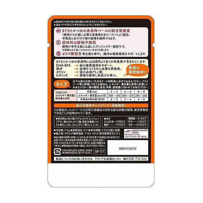 DHA、EPA、鉄分、タウリン、ビタミンEを含むまぐろとかつおの赤身肉ベースの総合栄養食。穀物が苦手な猫にも適したグレインフリー設計。善玉菌を増やし腸内の健康をサポートするオリゴ糖を配合。ゼリータイプ。