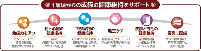 「a-iペプチド」と「DMHFを含むおいしい香り」がお部屋で暮らす愛猫の心の健康維持をサポート。食物繊維(セルロース)が体内の毛玉の排出をサポート。また、目と心臓の健康をサポートするタウリン、健康を維持し免疫力を保持するビタミンC・E配合。マグネシウムを調整して尿石の形成に配慮。必須脂肪酸のバランスを調整して皮膚と被毛の健康もサポート。うすく仕上げた粒で食べやすい。着色料不使用の国産品。