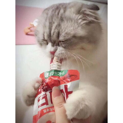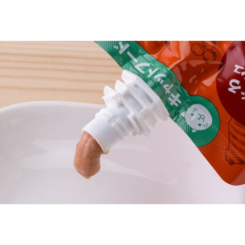 蓋が大きく開けやすい。スパウトが付いて手に持って与えやすく、汚れにくい。そのままおやつとして与える! いつものフードと混ぜ合わせて、嗜好性を高める! 水分の補給としても! にがいお薬と一緒に与えても!